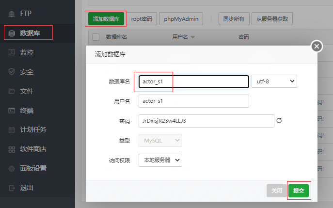 宝塔设置数据库root密码为123456,并创建以下数据库: