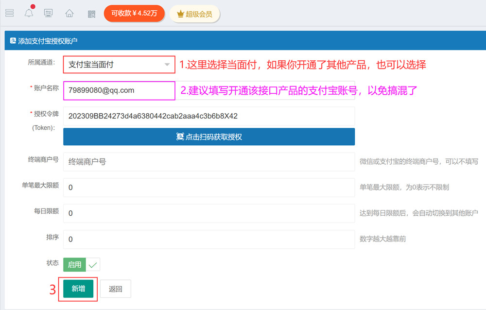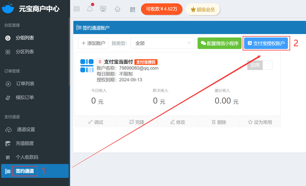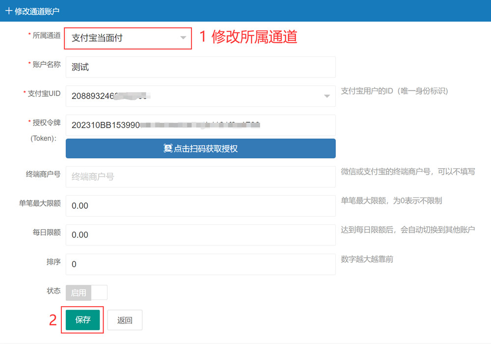 解决方案:重新编辑授权账户,把所属通道改为“支付宝当面付”,如下: