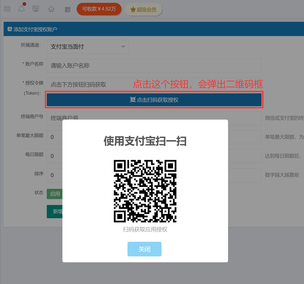 2、点击“添加支付宝授权账户”按钮,跳转到添加页面后,点击蓝色的“点击扫码获取授权”按钮,使用手机支付宝扫一扫