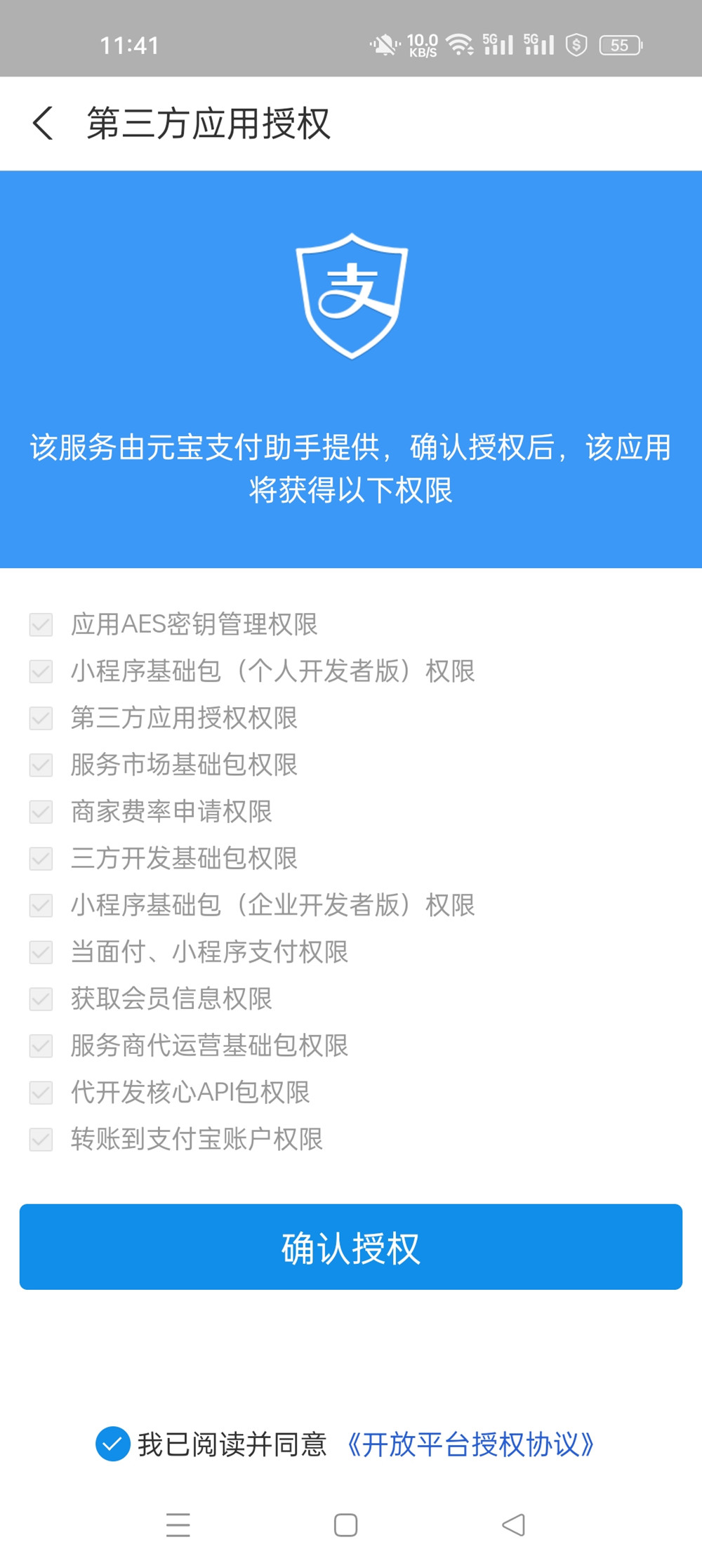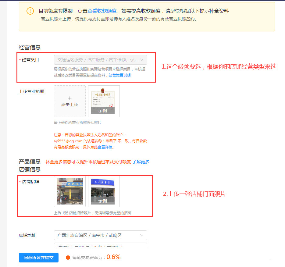 - 营业执照是可选的,不上传的话,限制单笔收款≤1500,单日收款≤2W,对于小网站来说,这个额度已经够用了。