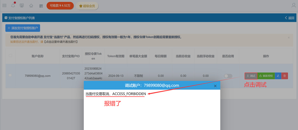 1、调试账户报错“当面付交易取消,ACCESS_FORBIDDEN”,提示这个错误,说明你的支付宝账号还没开通“当面付”产品,请先前往支付宝【当面付】页面申请开通。