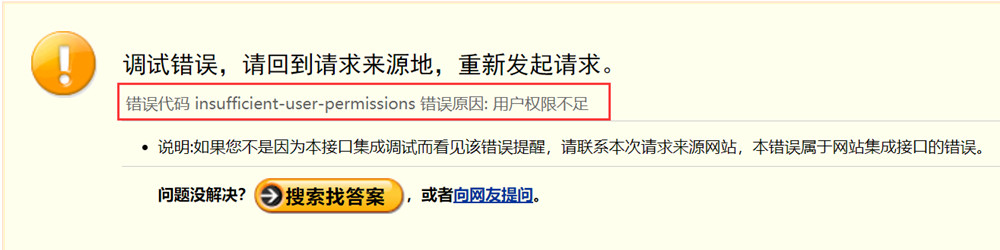 2、调试账户报错“错误代码 insufficient-user-permissions 错误原因: 用户权限不足”,提示这个错误,可能是选错了通道,你添加的是“支付宝当面付”,但却默认选择“支付宝电脑网站支付”