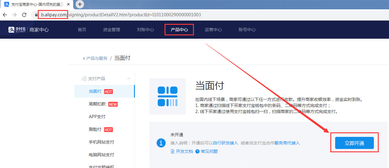 1、点击【当面付】进入,登陆支付宝账户,然后点击“立即开通”;