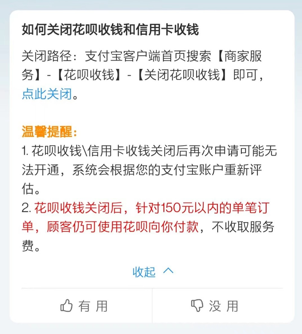 3、使用当面付的,建议关闭支付宝的“花呗收钱”功能,否则你的账号很容易被系统误判为花呗套现,从而导致当面付接口被禁用;