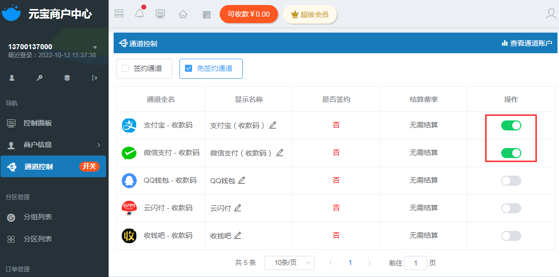 商户中心 → 通道控制,开启已经上传收款码的通道,如下图: