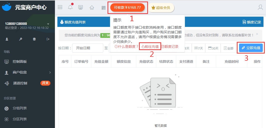 接口收款额度不足时,可在商户中心里进行充值: