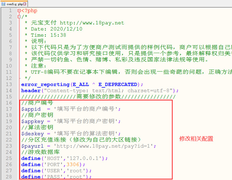第三步,用Notepad++、sublime text等编辑工具,参照示例里的使用说明.txt,修改config.php配置文件里的商户ID、商户密钥、算法密钥,数据库等信息,商户ID、商户密钥、算法密钥在【商户中心】 →【基本资料】里获取。