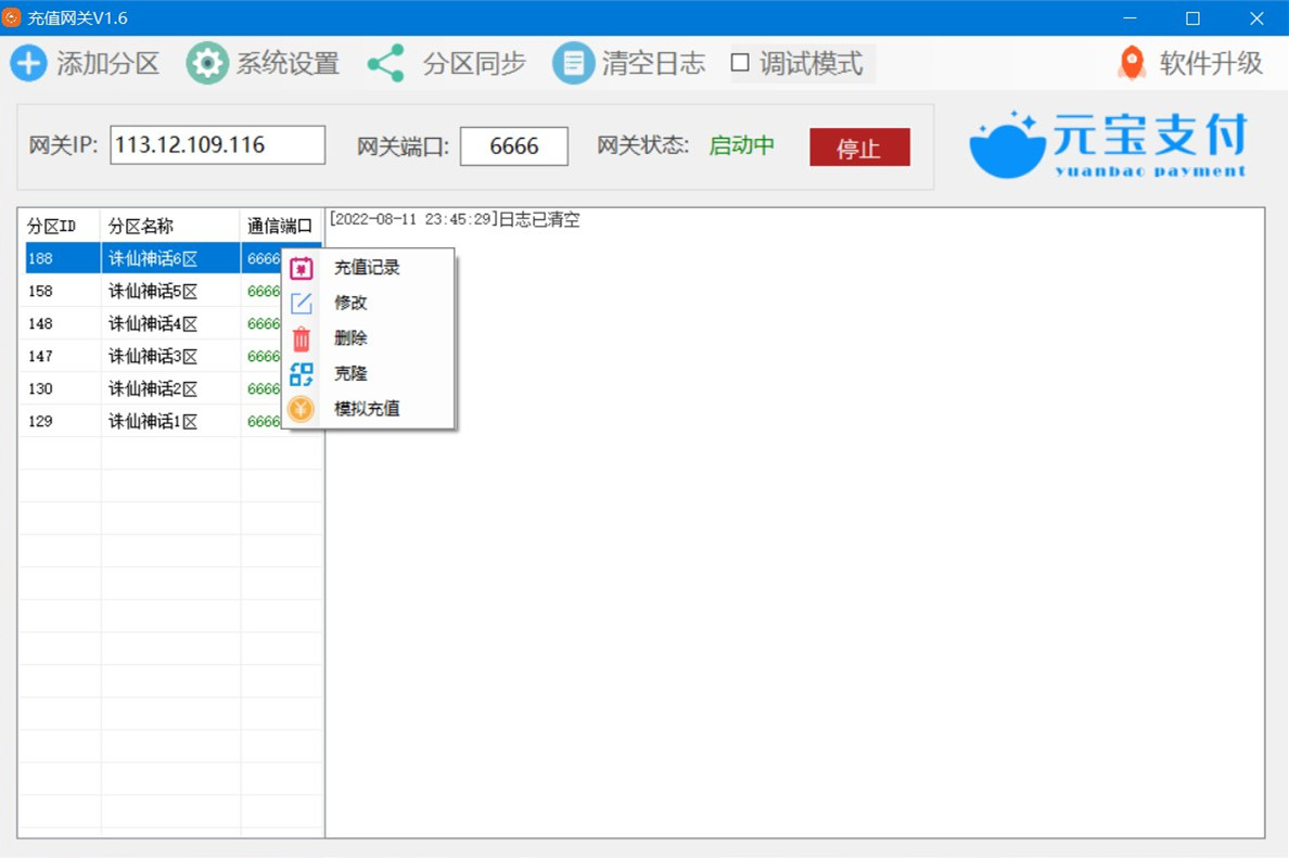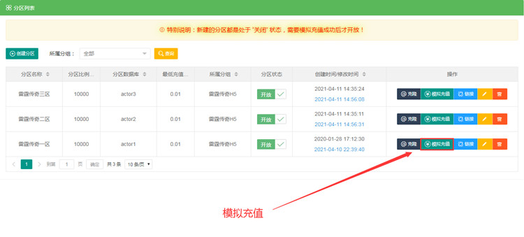 第四步,分区添加好后,先进行模拟充值,看分区配置是否正确,然后启动网关