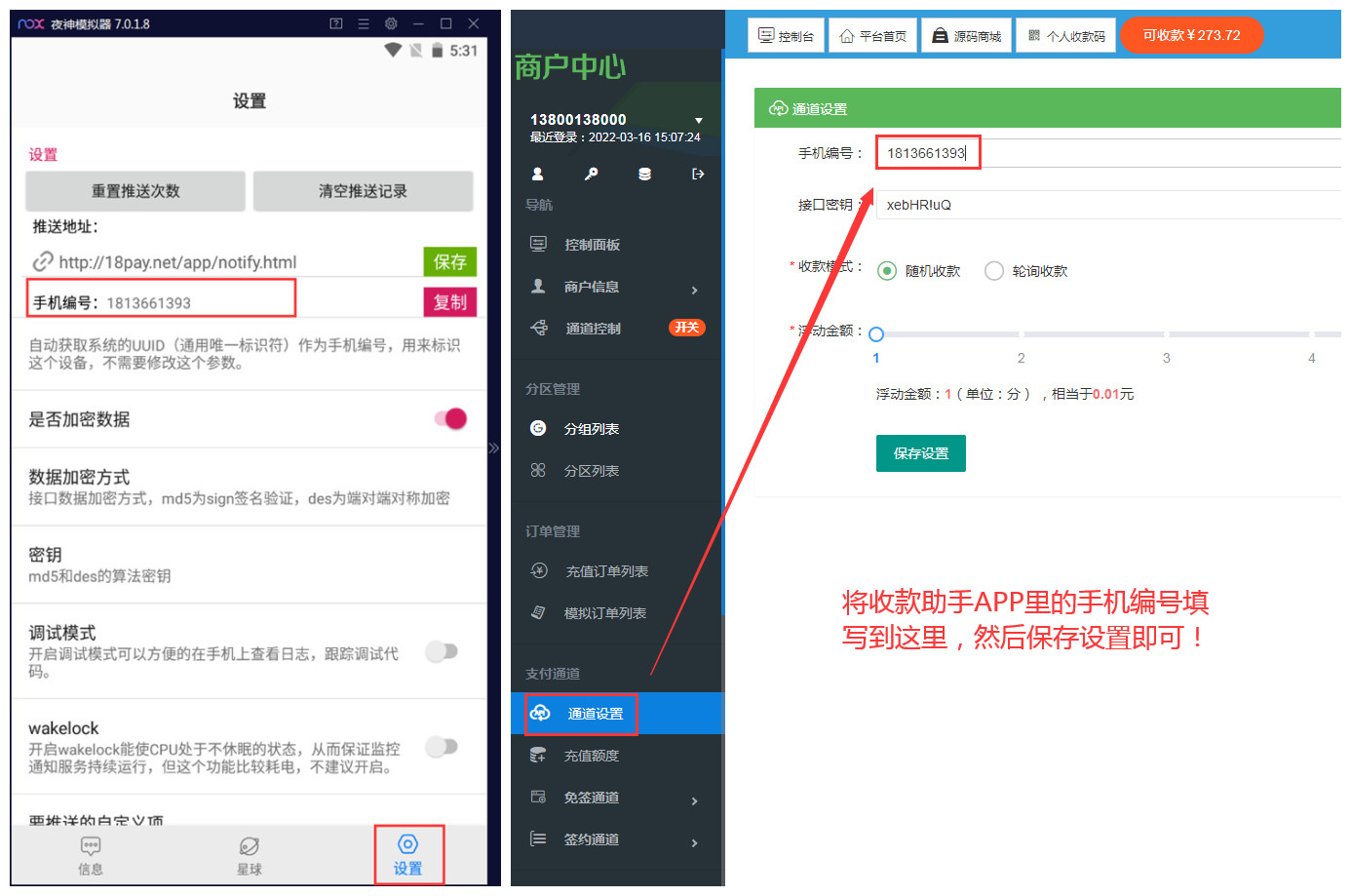 2、在收款助手APP的设置里查看手机编号,然后登录元宝支付平台,在 “支付通道” → “通道设置” 里填写手机编号并保存