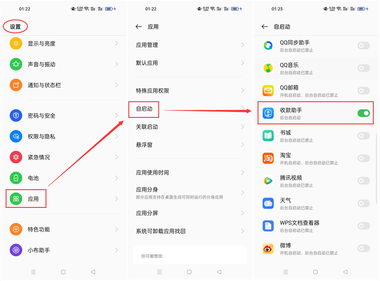 【设置】 → 【应用】 → 【自启动】在列表里找到支付宝、微信和收款助手APP,然后启动开关即可;